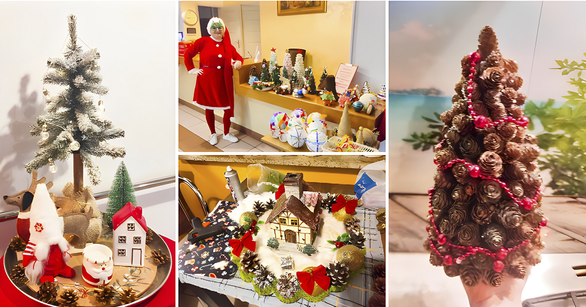 Przez ostatnie tygodnie nasz dom tętnił twórczą atmosferą. W sali terapii zajęciowej powstawały bożonarodzeniowe dekoracje: stroiki, zawieszki, kartki, wianki, drobne upominki. Były śmiechy, rozmowy, wspomnienia dawnych Wigilii, a także skupienie przy dopracowywaniu szczegółów. Dla wielu pensjonariuszy była to nie tylko praca plastyczna, ale także piękne przeżycie – możliwość wspólnego działania z myślą o innych.